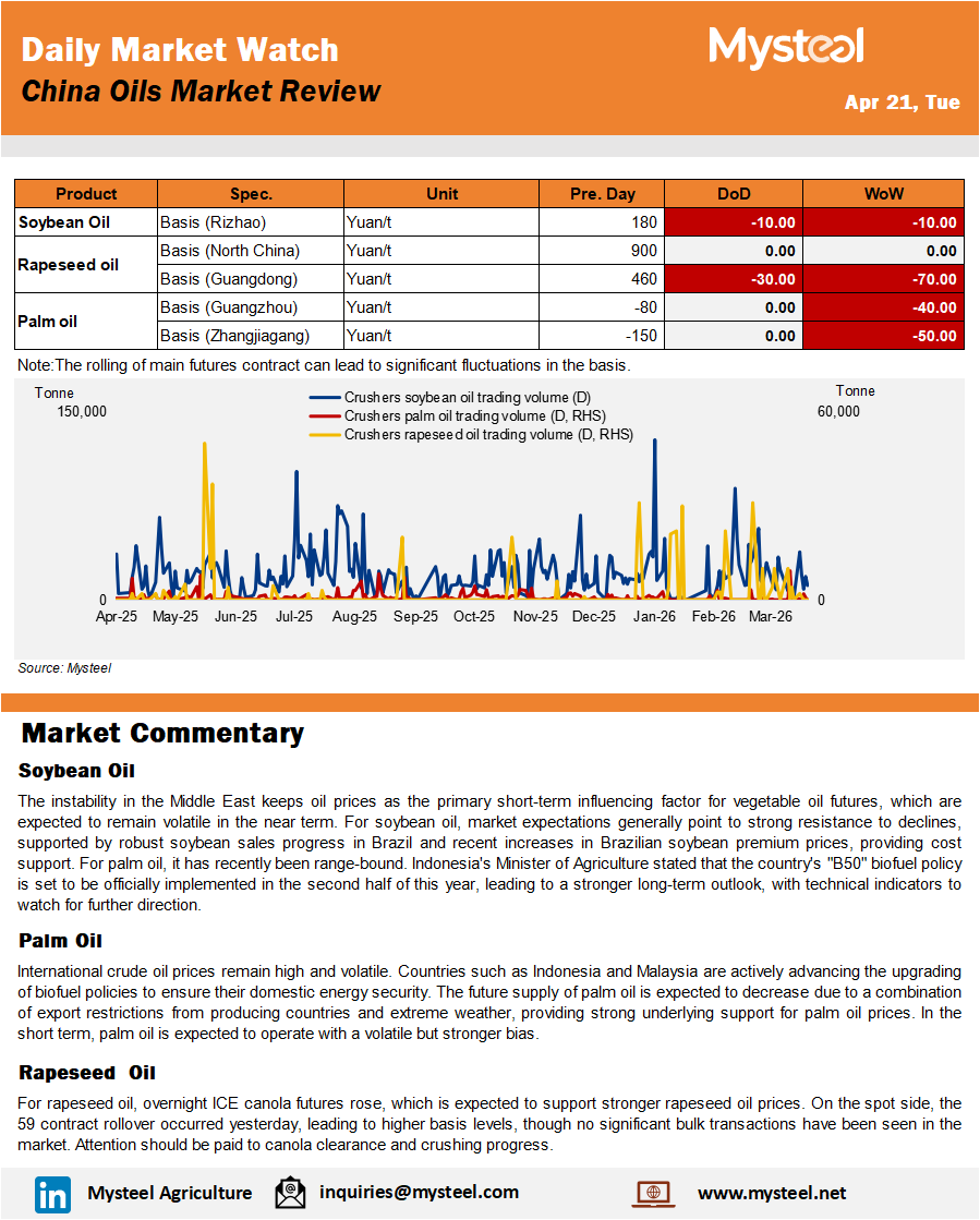 Mysteel oils market daily: The decline in vegetable oils has narrowed