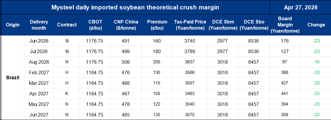 Mysteel daily China imported soybean crush margin tracking 20260427