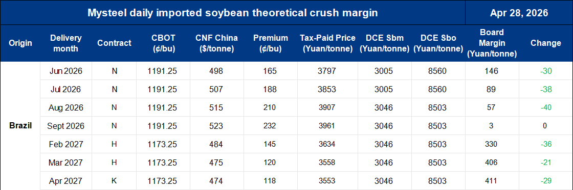 Mysteel daily China imported soybean crush margin tracking 20260428